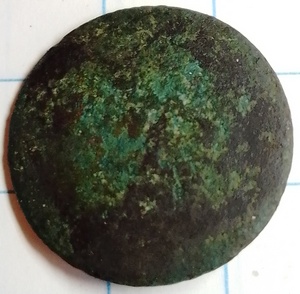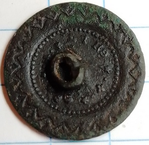 Platte knoop, voorheen verzilverd, met een mooie sierlijke achterkant waarop “gilt” staat.