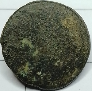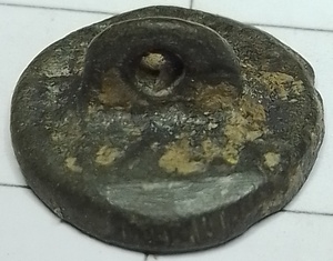 Een vroeg versie van een gegoten platte knoop. Gezien het metaal, de dikte en het oog is dit waarschijnlijk een heel vroeg model voor 1600