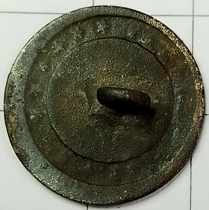 Platte knoop met op de achterkant een cirkel van sterren. Oogje en stempel zitten niet in het midden.