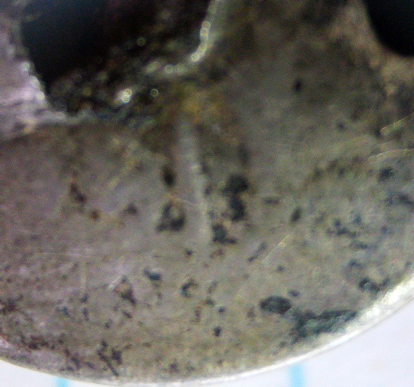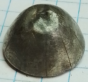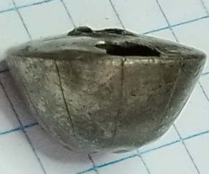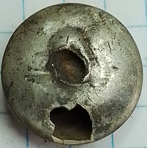 Zilveren knoop met een radmotief. Dit noemen ze ook wel eens een molenknoop omdat de gegrafeerde afbeelding lijkt op de wieken van een molen.