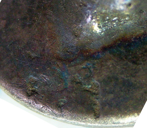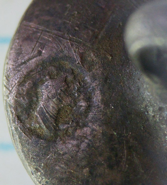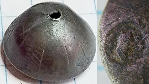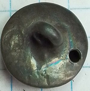 Zilveren knoop met een radmotief. Dit noemen ze ook wel eens een molenknoop omdat de gegrafeerde afbeelding lijkt op de wieken van een molen.