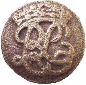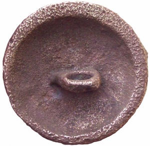 Licht convex gegoten knoop met hierop een monogram. Staafoog