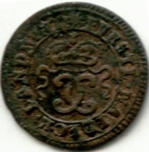 Plat gegoten knoop met hierop een monogram en staafoog. Van Waldeck Pyrmont zijn munten bekend met gekroonde monogrammen waarbij gespiegelde letters in elkaar haken. Deze knoop lijkt 2 letters G te hebben. Dan kan het hier wellicht gaan om Prins Georg Friedrich van Waldeck. Hij was met zijn legers in dienst van de staten generaal van de Nederlanden.