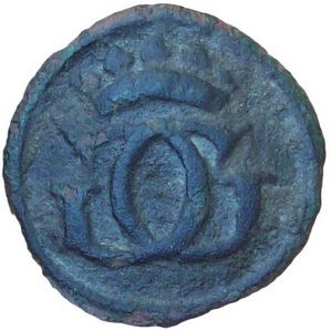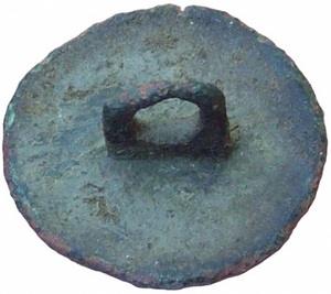 Plat gegoten knoop met hierop een monogram en staafoog. Van Waldeck Pyrmont zijn munten bekend met gekroonde monogrammen waarbij gespiegelde letters in elkaar haken. Deze knoop lijkt 2 letters G te hebben. Dan kan het hier wellicht gaan om Prins Georg Friedrich van Waldeck. Hij was met zijn legers in dienst van de staten generaal van de Nederlanden.