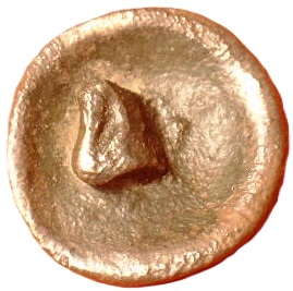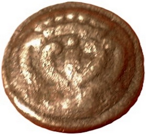 Licht convex gegoten knoop met hierop een monogram. Plat staafoog