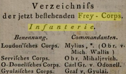 Regimentsknoop met de gekroonde letters F.C.I. In de lage landen waren in de 18de eeuw diverse ingehuurde vaak Duitstalige legers actief. Een aantal van deze heette “Frey Corps” en hier had je dan weer diverse varianten van. Ik heb het vermoeden dat het bij deze knoop gaat om een Frey Corps Infanterie (FCI). Hier een afbeelding uit een Oostenrijkse militaire almanak uit 1793. De knoop is overigens gevonden in voormalig Oostenrijks Nederland, dus dit maakt het aannemelijk dat het hierbij gaat om een Oostenrijks regiment.