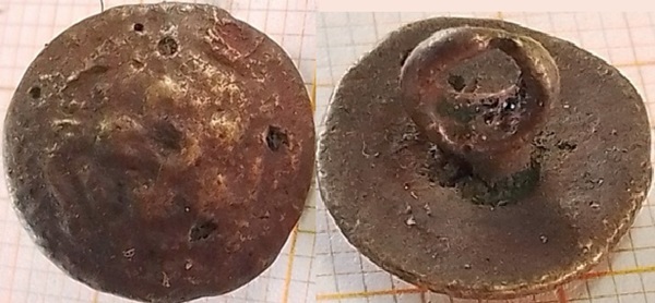Knoopje met roosje. Parelrand is nauwelijks te zien. Opvallend zijn de kleine gaatjes in de legering en de strakke achterkant.