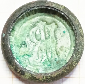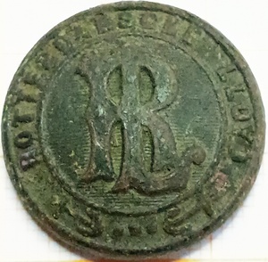 Knoop met de initialen R.L. met omschrift “Rotterdamsche LLoyd” tussen 2 kleine ankertjes. Achterkant ontbreekt.