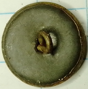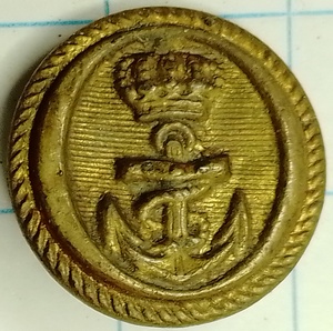 Knoop van waarschijnlijk de royal navy (onzekere determinatie). Gekroond anker met oog en ankertouw op een met horizontale strepen gearceerde achtergrond. Achtergrond is ovaalvormig.