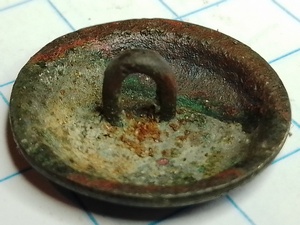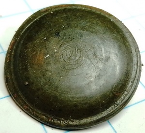 Schotelvormige messing knoop met draaibank sporen en een rond oplopende rand