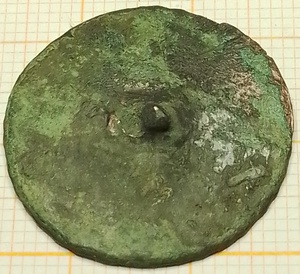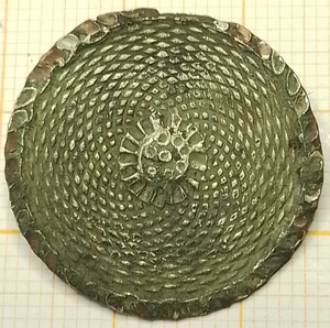 Sierknoop waarbij diverse subtiele spiraalmotieven in elkaar overlopen. In het midden een klein abstract bloemetje. Deze knoop is verzilverd met de methode Old Sheffield Plate. Hierbij wordt onder druk een dun zilver plaatje met koper versmolten. Deze techniek werd toegepast in de periode 1740-1840. De verzilvering is nog gedeeltelijk aanwezig. Op de achterzijde een afgebroken gietdraadoog. Gezien het ontbreken aan een backmark is deze knoop voor 1800 gemaakt.