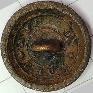 Vz: leeuw die een schild vasthoudt met hierin een gekroond wiel. Onderschrift bij de leeuw “L’Union fait la force” (Eendracht maakt macht). Deze knoop lijkt zwart geverfd te zijn en hiermee kun je concluderen dat deze in 1914 nog in gebruik was.