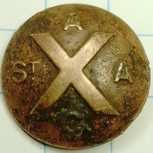 Knoop met hierop de hoofdletter X die gelinkt is aan het kruis op de Schotse vlag. Aan de zijkanten de letters ST A A C. Dit staat voor St Andrews Ambulance Corps uit Schotland. Deze knoop is waarschijnlijk in WWI in Nederland beland toen dit corps een hospitaal had in Frankrijk maar ook eentje op een schip.
