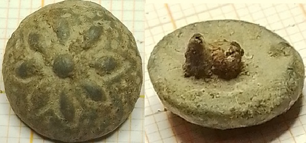 Knoop van tin met achtbladige (kerst)ster op een geometrisch motief. Op de achterkant zie je een gietnaad. Oogje ontbreekt. Dit is waarschijnlijk een draadoogje van ijzer geweest.