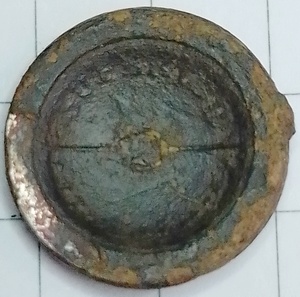 Licht convexe dikke knoop met op de achterkant “superior”. Dit is dus een verzilverde knoop geweest. Er zijn nog sporen van zilver op de achterkant terug te vinden.