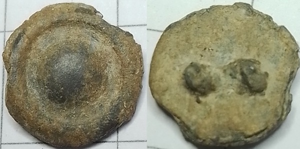 Plat rond knoopje met hierop een cirkel. Op de achterkant een afgebroken oogje