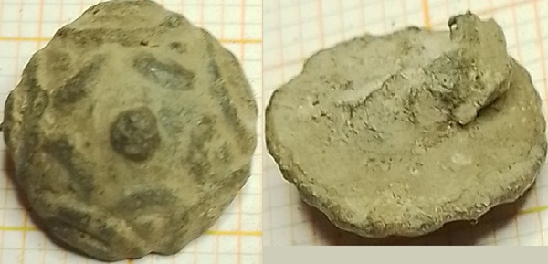 Knoop van tin met geometrisch motief. Oogje ontbreekt