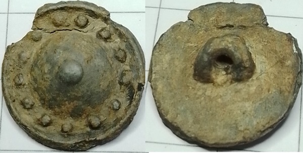 Plat rond knoopje met hierop een kegeltje omringt door bolletjes. Op de achterkant een oogje