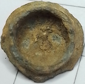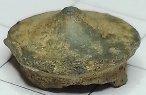 Onzeker of dit een knoop is. Het is een soort kegeltje met een randje. Het lijkt hierdoor op een heel klein dekseltje. Geen oogje