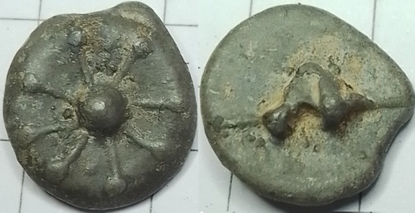 De afbeelding van het zonnetje met bolletjes is ook terug te vinden in Read afb 103 datering ca 1400-1500. Dit is echter een koper hol knoopje met draadoog.