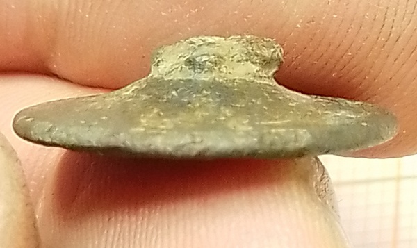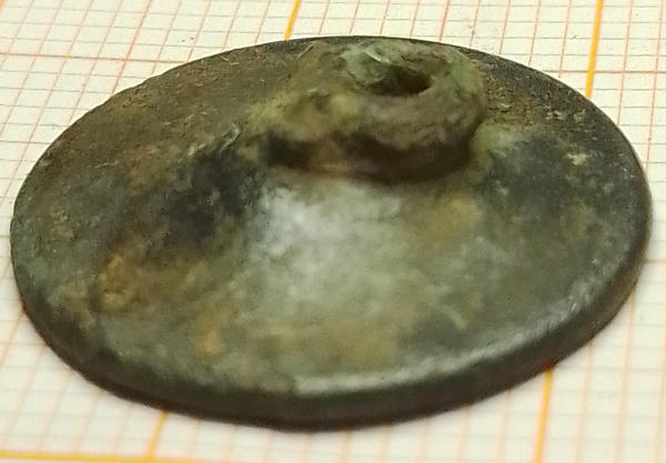 Tombakknoop van 18mm met op de achterzijde een vulkaan-bevestiging die tussen blob en kegel inzit.