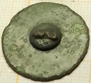 knoop tombak klein 24mm Author: Mark Ouwerkerk Published Date: 22 april 2025 Knoopje van tombak, 24mm Kz: oogje(afgebroken) in half bolletje Categorieën: CAT084, tombak (ca 1760-1810) Gerelateerde producten knoop large-button cirkelpatroon 39mm tombak kegel Lees verder knoop tombak standaard (1775-1815) Lees verder knoop tombak standaard klein – embedded wire (1775-1815) Lees verder knoop tombak standaard 15mm Lees verder