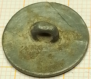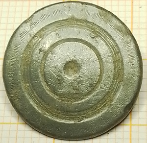 knoopje van tombak met hierop concentrische ringen en een lichte gravering. Op de achterkant een meegegoten oog