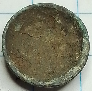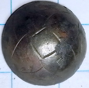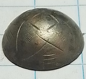 Koepelvormige tombak knoop van 20mm met een eenvoudige versiering. Deze lijkt op een imitatie van een zilveren knoop.  Waarschijnlijk is het geheel verlijmd geweest. Lijm/hars is nog zichtbaar