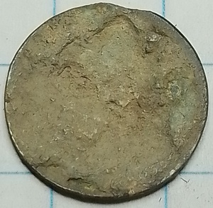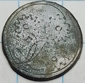 Platte tombak knoop van 16mm met een gegrafeerde versiering van 3 bloemen. Deze lijkt op een imitatie van een zilveren knoop. Waarschijnlijk zijn een ijzeren achterplaat en oog verlijmd geweest. Lijm/hars is nog zichtbaar