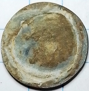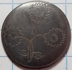 Platte tombak knoop van 24mm met een gegrafeerde versiering van 3 bloemen. Deze lijkt op een imitatie van een zilveren knoop. Op de achterkant zie je nog sporen van een ijzeren achterplaat plus oog. Waarschijnlijk is het geheel verlijmd geweest. Lijm/hars is nog zichtbaar