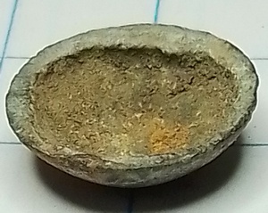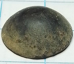 Koepelvormige tombak knoop van 15mm. Waarschijnlijk heeft hier een ijzeren binnenwerk in gezeten dat verlijmd is geweest. Lijm/hars is nog zichtbaar