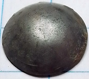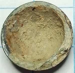 Koepelvormige tombak knoop van 16mm. Waarschijnlijk heeft hier een ijzeren binnenwerk in gezeten dat verlijmd is geweest. Lijm/hars is nog zichtbaar