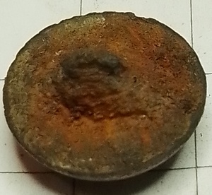 Tombak knoop met (verroest) ijzeren oog. Waarschijnlijk is dit oog hierin verlijmd