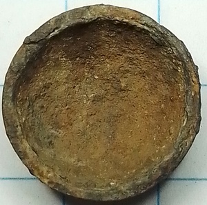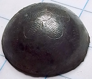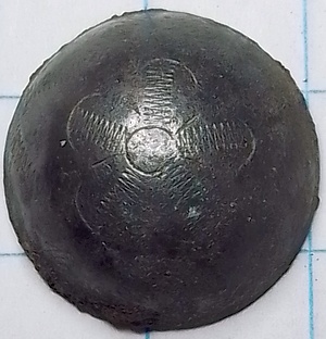 Koepelvormige tombak knoop van 20mm met een eenvoudige versiering. Deze lijkt op een imitatie van een zilveren knoop. Waarschijnlijk is het geheel verlijmd geweest. Lijm/hars is nog zichtbaar