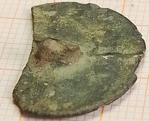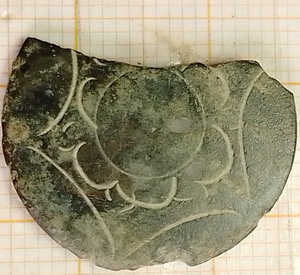 Knoopje (afgebroken) van tombak met een bloemetje erin gegrafeerd