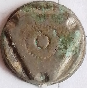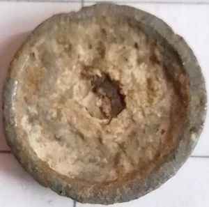 Reliefknoop van tombak, met een driehoek in relief. In het scheepswrak Sophia Albertina vergaan 20 augustus 1781 is een zelfde knoop gevonden. referentie