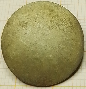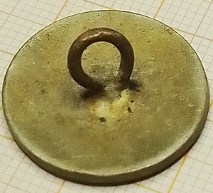 Deze knoop kan van gele tombak zijn of van messing. De dikte en afwerking doet vermoeden dat deze uit de luxe periode uit de 18de eeuw komt. Het oogje is eigenlijk wat klein voor een blob-tombak bevestiging dus waarschijnlijk gaar het hier toch om messing