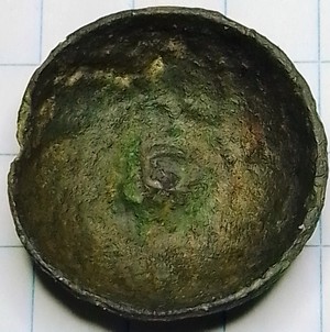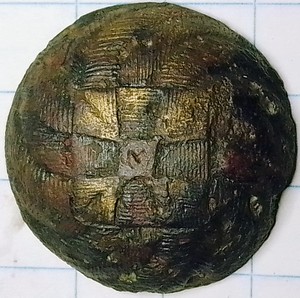 Grote bolle knoop (32 mm) met hierop een kruis met daar omheen spiraalvormig waaierpatroon of veren. De knoop is (gedeeltelijk) verguld. Gezien de grootte, grofheid, extravagante stijl (ook verguld) en de dikte van het metaal lijkt mij dit een knoop net iets voor de dandyperiode. Onzekere datering