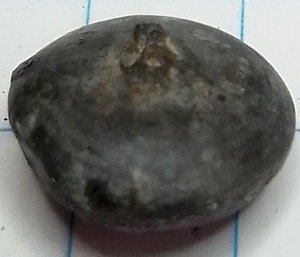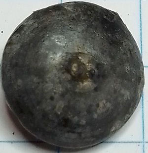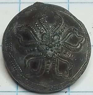 Deze sierlijke waarschijnlijk zwart geverfde holle bolle gesoldeerde knoop heeft een afbeelding erop van een vijfbladige bloem met in het midden een klein bloemetje. Tussen de bladen in parels. Randen ook versierd. Op de achterzijde zijn nog sporen te zien van het ontbrekende draadoogje. Dit impliceert in dit geval een tinnen knoop.