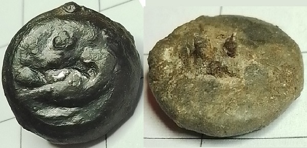 Klein plat knoopje met afgebroken draadoog. Er lijkt een vogel op te staan