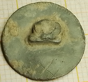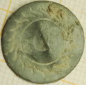 Plat rond knoopje met een waaier cirkel van loodtin van ca 17mm. Op de achterkant zit een lusoogje