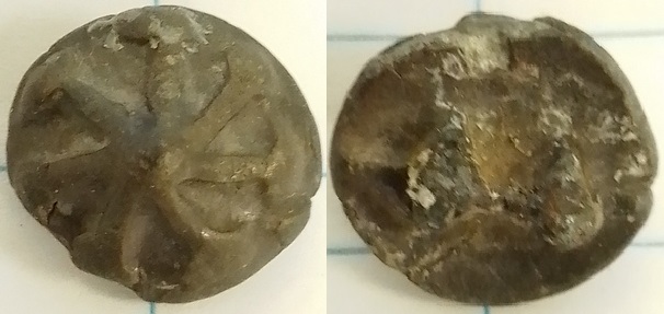 Bronzen of tinnen knoop met hierop een waaier. In Buttons & Fasteners 500 BC-AD 1840 paperback staat een vergelijkbare bronzen knoop met waaier (fig.7.18 t/m 7.22) datering 1475-1600