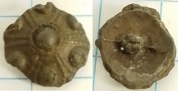 Knoop van tin met geometrisch motief. Op de achterkant zie je een gietnaad. Oogje ontbreekt.