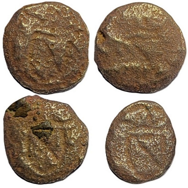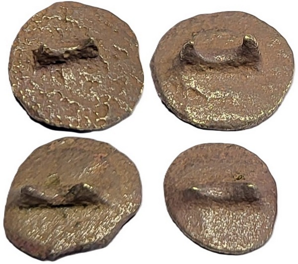 Vier knopen met gekroonde wapenschild. Op het schild loopt een diagonale lijn van links boven naar rechts onder. Dit is vergelijkbaar met het wapen van Utrecht. Op de keerzijde zit een plat relatief kort (afgebroken) staafoogje. Knopen met wapenschilden kwam ook al voor 1600 voor. Gezien de wat grovere afwerking en het gebruik van een meegegoten kort kort staafoogje lijkt mij dit een knoopje uit de periode 1500-1600. De knoop zou ook nog wat ouder kunnen zijn.