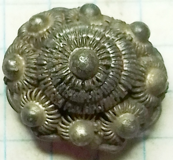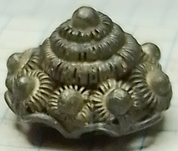 Zeeuwse knoop (of knoop omgebouwd tot ring) gestapeld opgebouwd met filigrain. Knoop heeft 8 bolletjes aan de buitencirkel en één op de top van de opbouw. Mist oogje op achterzijde.