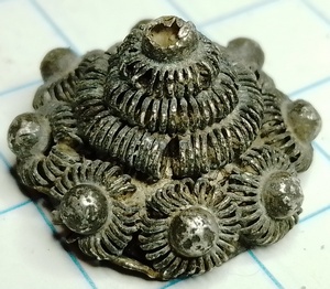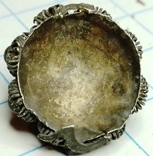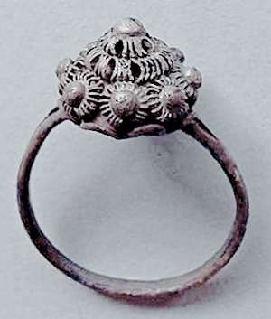 Zeeuwse knoop (of knoop omgebouwd tot ring) gestapeld opgebouwd met filigrain. Knoop heeft 8 bolletjes aan de buitencirkel en één op de top van de opbouw. Mist achterzijde.