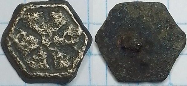 Zeshoekige knoop van messing, versierd. oogje ontbreekt. Dergelijke knopen staan in “Schatten uit de Schelde” 1987 en krijgen daar een datering voor 1530