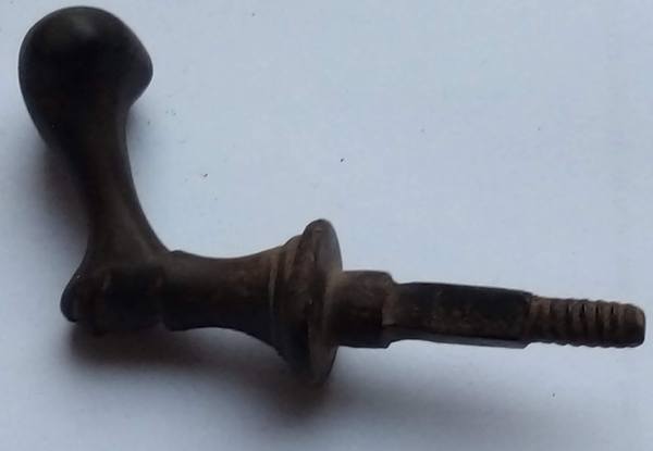 Knop die een gedeelte uitstak zodat je er aan kon trekken. Een deel vierkant zodat de knop niet kon draaien. Schroefdraad om een veer of draad aan te bevestigen.