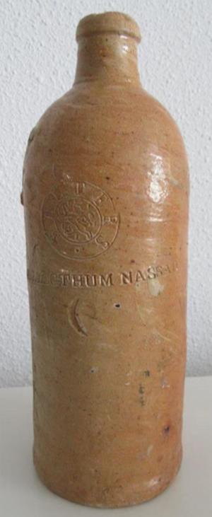Scherf van een steengoed jeneverkruik met hierop een medaillon, omschrift: “SELT(ERS) NASSAU”. In middenveld: gekroonde adelaar, met op de borst de initialen: “FB”. Afkomstig uit Duitsland, Niedersalte. Datering na 1866