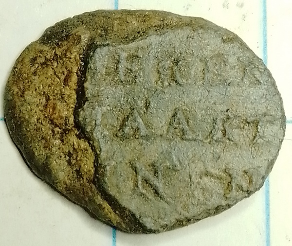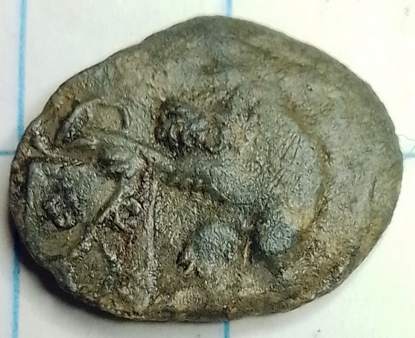 Lakenlood (kleine versie) met aan voorzijde een naar links kijkende klimmende leeuw met het wapen van Leiden, de twee gekruiste sleutels. Datering 1650-1750